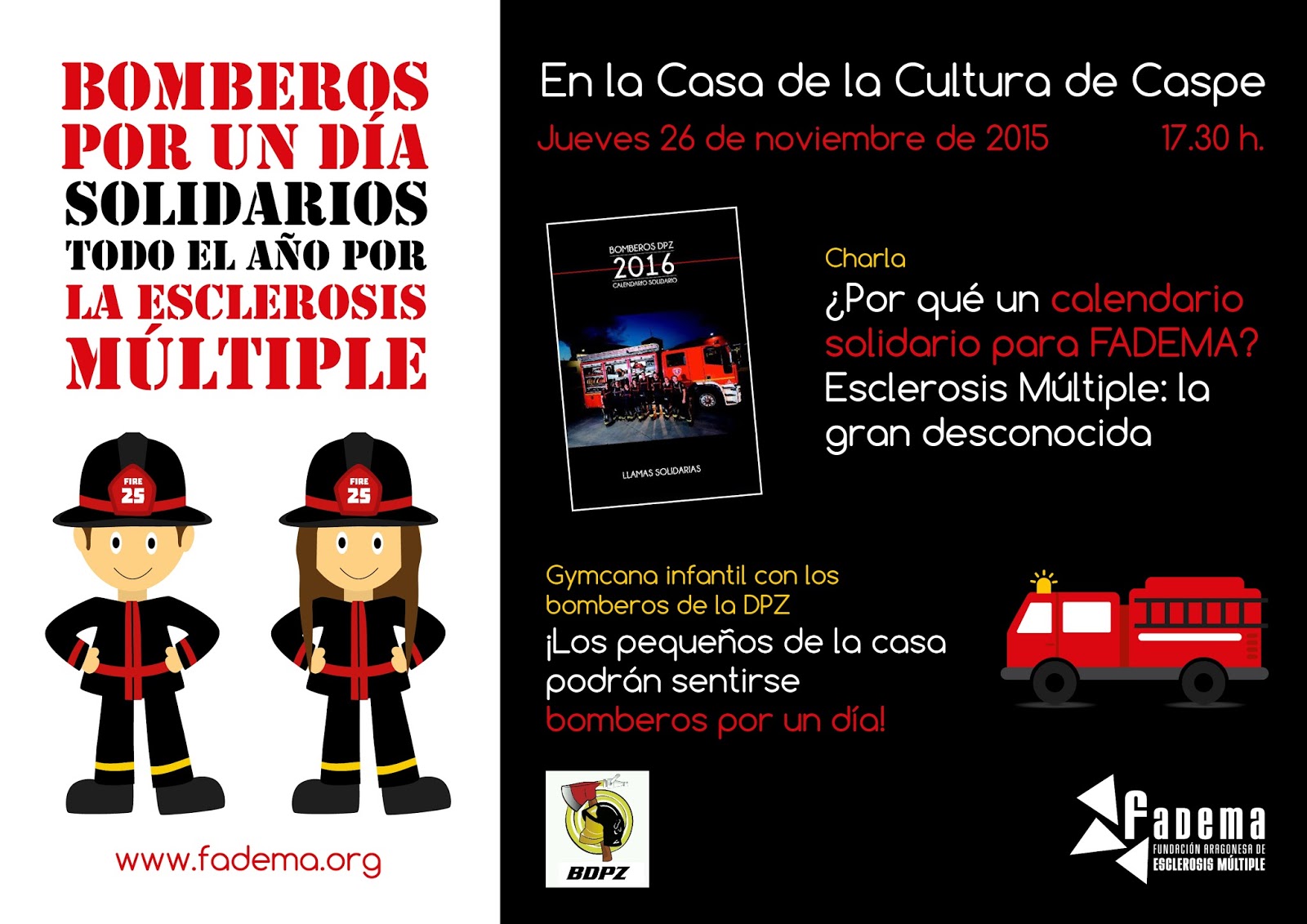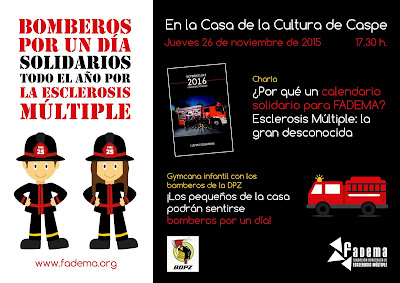 “Bomberos por un día, solidarios todo el año por la Esclerosis Múltiple” es el lema de la jornada organizada para el próximo jueves, 26 de noviembre, por la Fundación Aragonesa de Esclerosis Múltiple (FADEMA) y la Asociación Deportiva y Cultural Bomberos de la Diputación Provincial de Zaragoza en la Casa de Cultura de Caspe. En torno a la iniciativa del calendario solidario que los bomberos han realizado para recaudar fondos para ayudar a las personas con EM, en las actividades organizadas para el próximo jueves en Caspe, a partir de las 17:30 horas, los más pequeños podrán disfrutar de una gymcana infantil, convirtiéndose en bomberos, y los mayores podrán conocer el trabajo, programas y servicios que FADEMA pone a disposición de los afectados.