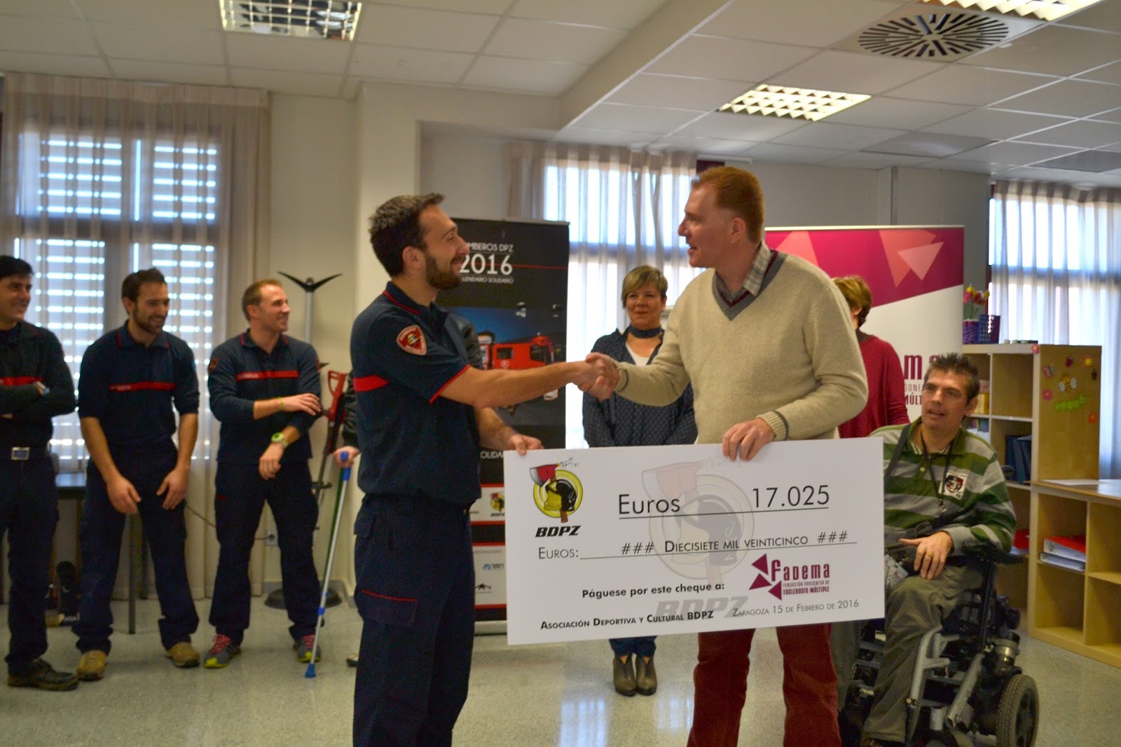 Un total de 17.025 euros, muy solidarios, ha sido la recaudación obtenida por el calendario benéfico promovido por la Asociación Deportiva y Cultural Bomberos de la Diputación Provincial de Zaragoza para colaborar con la Fundación Aragonesa de Esclerosis Múltiple. Con esta altruista aportación, los bomberos de Diputación de Zaragoza han querido sumar su apoyo a los necesarios servicios y programas en los que trabaja FADEMA.