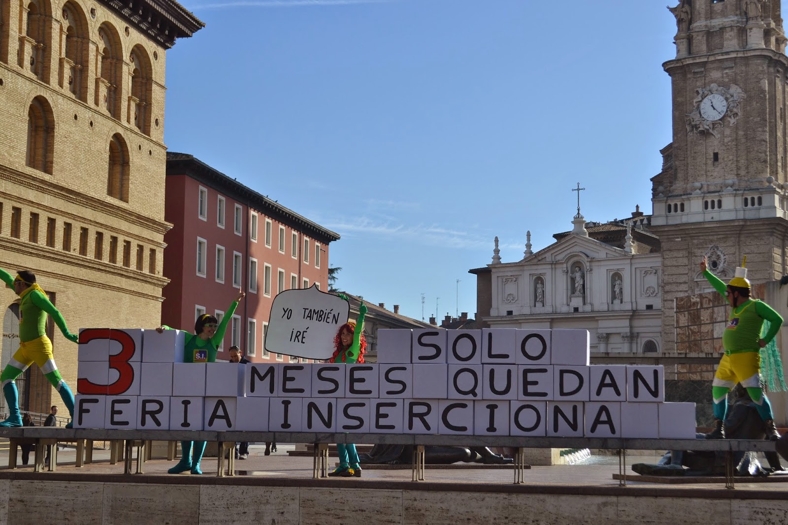 Este vídeo (ver vídeo), y las fotos, demuestran que los «Superinsercionadores» existen y tienen una misión muy especial en Zaragoza. Hoy han enviado un comunicado asegurando que mañana a las 12:00 horas, volverán a la capital aragonesa para realizar otra importante acción, esta vez junto a los leones del Puente de Piedra (margen derecha). Estos superhéroes y superheroínas se identifican bajo las siglas SI de “SuperInsercionadores” y utilizan sus prodigiosos poderes para dar a conocer la feria INSERCIONA 2015: “Empresas socialmente responsables”, que tendrá lugar los días 18 y 19 de febrero en la Sala Multiusos de la capital aragonesa. Y es que las entidades convocantes, la Asociación Aragonesa de Empresas de Inserción, y la Federación estatal de este sector, FAEDEI, han querido contar con estos convincentes personajes para tomar la calle en puntos emblemáticos de la ciudad, los días 18 de cada mes hasta el 18 de febrero, que se inaugurará este evento. La feria será un relevante encuentro de negocios que mostrará la oferta de productos y servicios de las más de 200 empresas de inserción que operan y genera más de 4.500 empleos, de los que aproximadamente el 60% son para personas con dificultades.